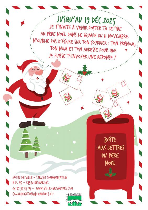 Jusqu'au 19 décembre 2025 je t'invite à venir déposer ta lettre au Père Noël dans la boîte mise à disposition à l'entrée du square du 11 novembre. N'oublie pas d'écrire ton prénom, ton nom et ton adresse pour que je puisse te répondre très prochainement.