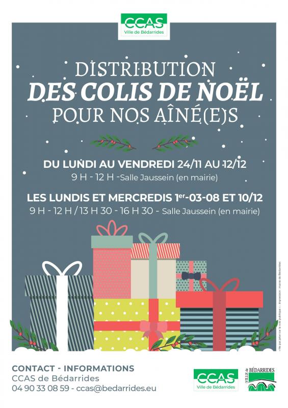 Le Lundi 24 Novembre 2025 Comme chaque année le CCAS procèdera à la remise des colis de Noël auprès de nos aîné(e)s. La distribution débutera le 24 novembre 2025 et se poursuivra jusqu'au 12 décembre 2025.