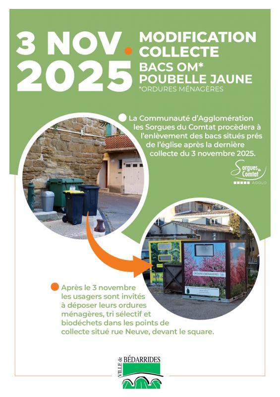 La Communauté d'Agglomération les Sorgues du Comtat procèdera à l'enlèvement des bacs situés prés de l'église, face sud, après la dernière collecte du 3 novembre 2025.